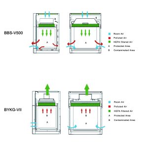 1) Neither vertical nor horizontal laminar flow hoods are appropriate in the presence of biohazards. Only an approved containment system, such as a Class II, Type A2 Biosafety Cabinet, should be used in applications requiring Biosafety Level (BSL) 2 or 3 containment.