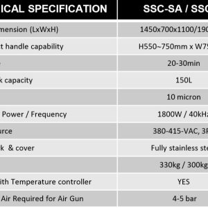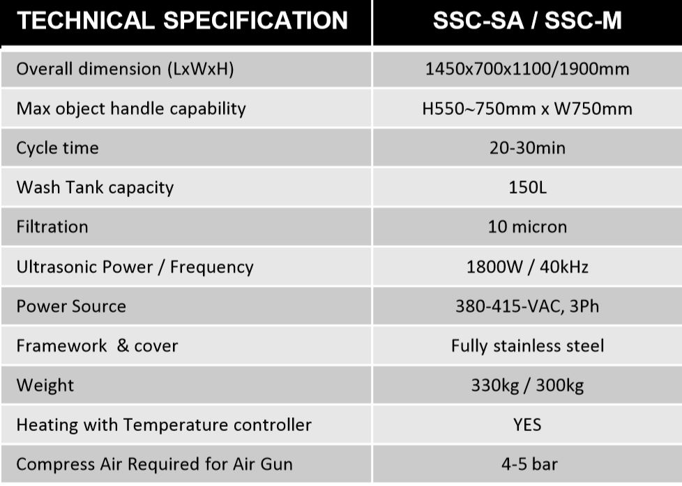 Both systems with common process feature integrated such as overflow with level sensor protection, pump & filter circulating with gauge for pressure indicate, heater for liquid with digital temperature control & setting, in term of air blow SSC-M with air gun manually blow off the water or chemical after wash.