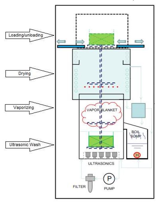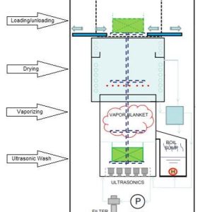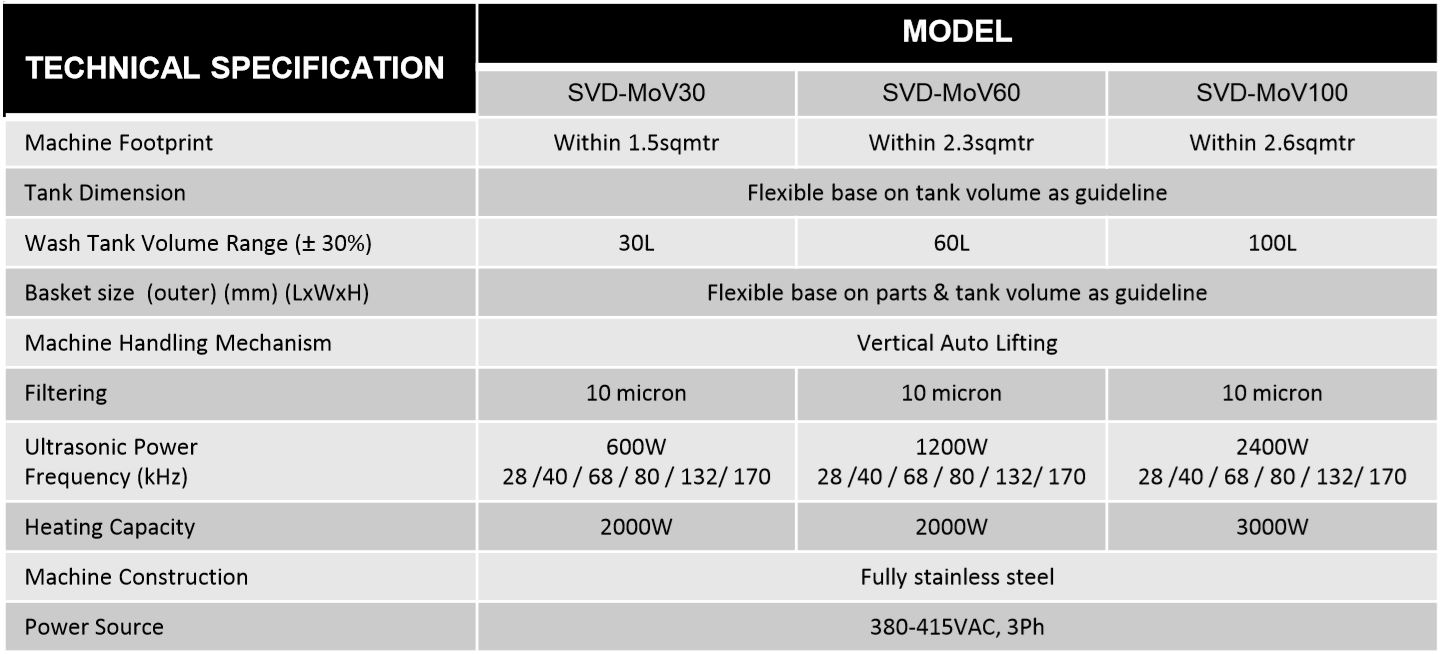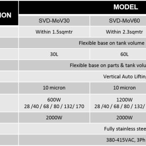 The SVD-MoV integrated with auto lifting mechanism carry the basket go through cleaning & vaporizing process in vertically, the system consists of features such as chiller double cooling freeboard, separator tank for water/solvent separation & closed-loop filtration.