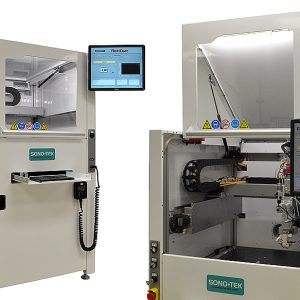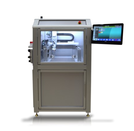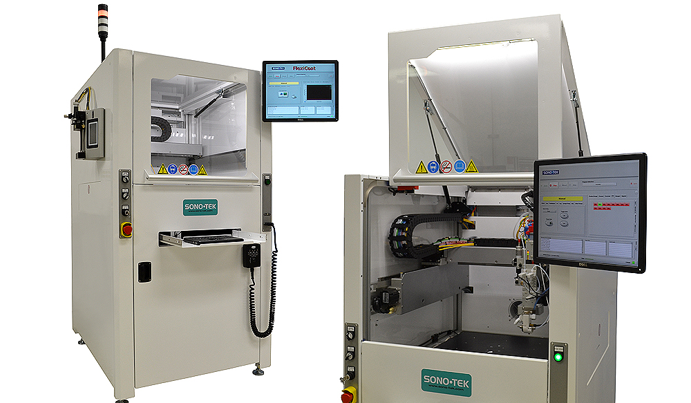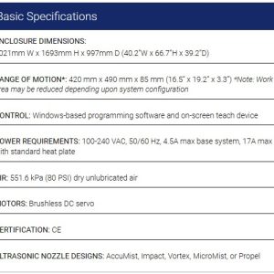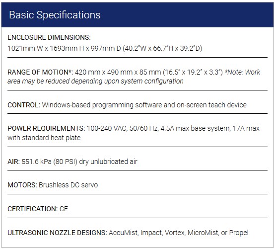 A standalone programmable three-axis robot ultrasonic full coating solution. This system employs robust ball-screw slides driven by brushless DC servo motors. Spray pattern widths can be easily shaped depending on which nozzle is used. Custom Windows-based software makes it easy to program and store a variety of spray patterns for automated processes.